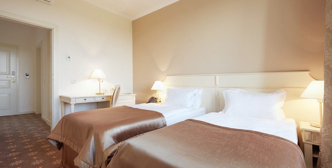 В номере: две односпальные кровати, прикроватные тумбочки, стол, стулья, шкаф, кондиционер, мини-холодильник, сейф, телевизор ЖК, телефон, чайный набор посуды
