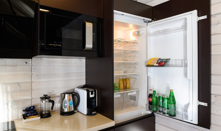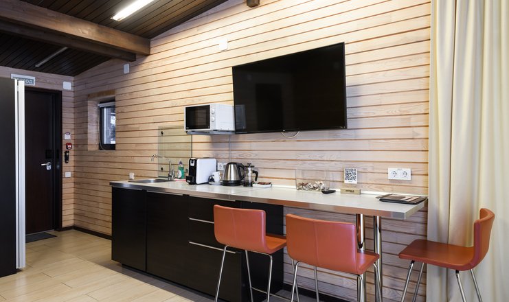 В номере: вешалка, кресло-кровать, кровать двуспальная, обувная полка, прикроватные тумбочки, стулья, Мини-кухня, кофемашина, микроволновая печь, мини-холодильник, сейф, телевизор ЖК, телефон, чайный набор посуды, электрочайник