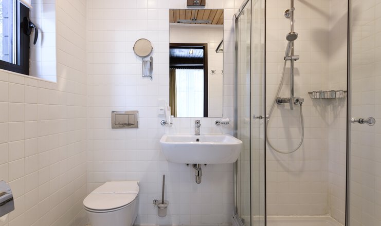 Санузел: с душевой кабиной, тапочки, туалетные принадлежности, фен, халат
