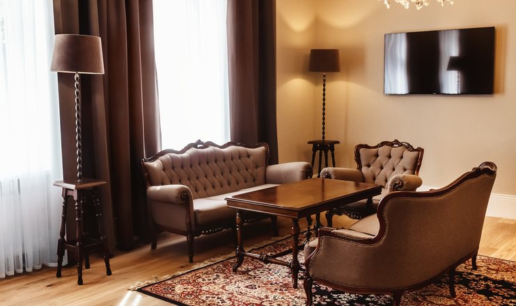 В номере: комод, кровать двуспальная, набор мягкой мебели, прикроватные тумбочки, стол, столик журнальный, шкаф, шкаф для посуды, кондиционер, кофемашина, сейф, телевизор ЖК: спутниковое ТВ