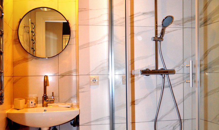 Санузел: с душем, тапочки, туалетные принадлежности, фен, халат