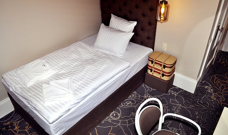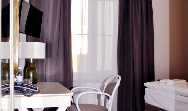 В номере: кровать односпальная, прикроватная тумбочка, шкаф, кондиционер, кофемашина, сейф, телевизор ЖК: спутниковое ТВ, телефон