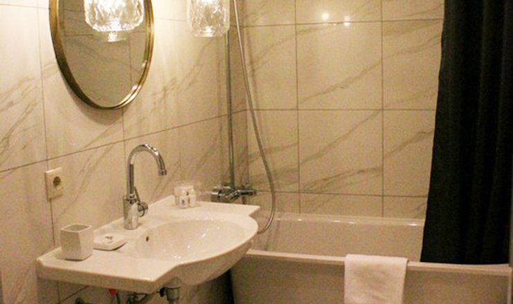 Санузел: с ванной или душевой кабиной, тапочки, туалетные принадлежности, фен, халат