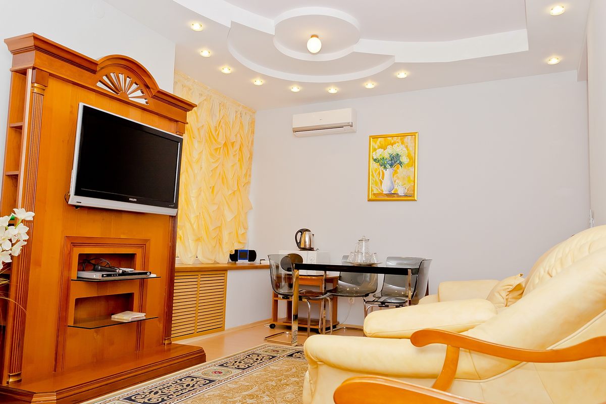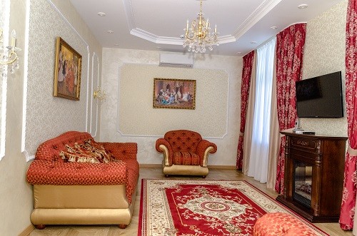 В номере: Гостинная: телефон, телевизор, DVD-проигрыватель, диван-кровать, стенка-горка. Спальная: двуспальная кровать, комод, столик прикроватный, телевизор. Гостинная-столовая: холодильник, телевизор, кухонный гарнитур, микроволновая печь, электрический чайник.