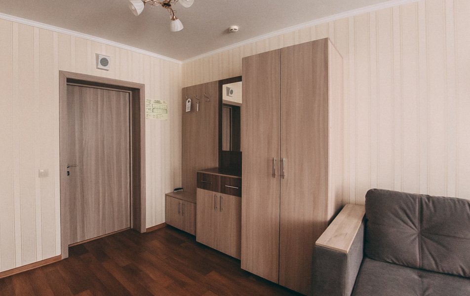 В номере: вешалка, диван, зеркало, кровати односпальные /одна двуспальная кровать, прикроватные тумбочки, стол, стул, шкаф, кондиционер, мини-холодильник, телевизор ЖК, телефон, чайный набор посуды, электрочайник