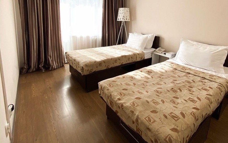 В номере: кровати односпальные /одна двуспальная кровать, прикроватные тумбочки, стол, стул, шкаф, телевизор, телефон, чайный набор посуды, электрочайник