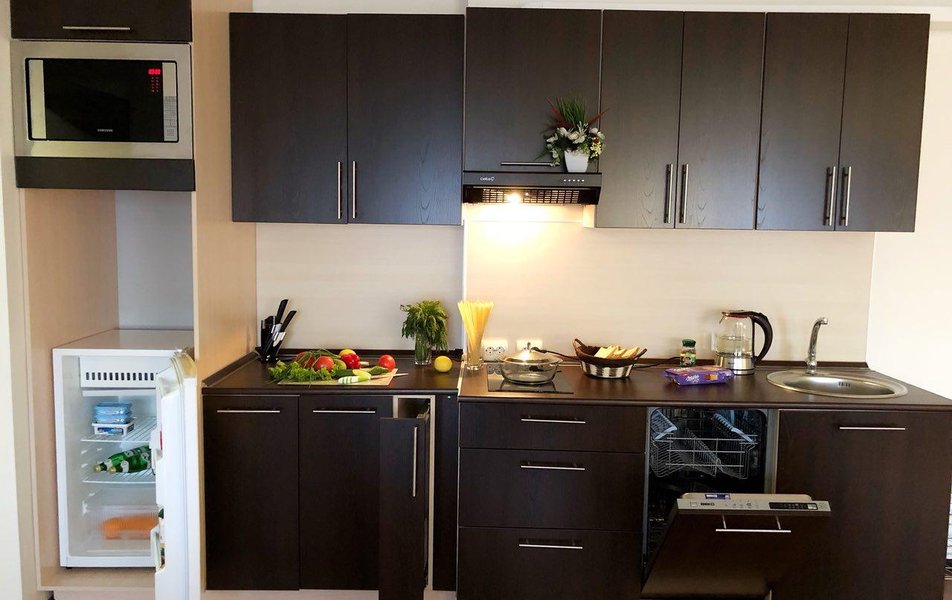 В номере: кухня, диван раскладной, кровать двуспальная, прикроватные тумбочки, стол, столик журнальный, стулья, шкаф, гладильная доска, кондиционер, микроволновая печь, набор посуды, плита электрическая, посудомоечная машина, телевизор, телефон, утюг, холодильник, электрочайник