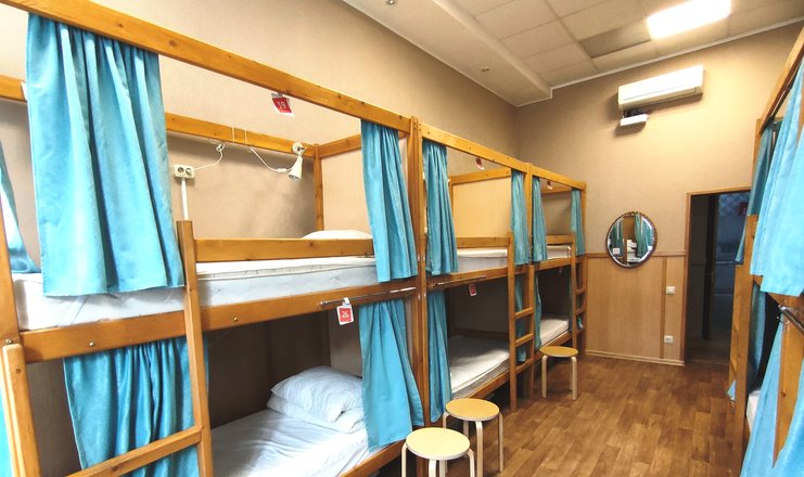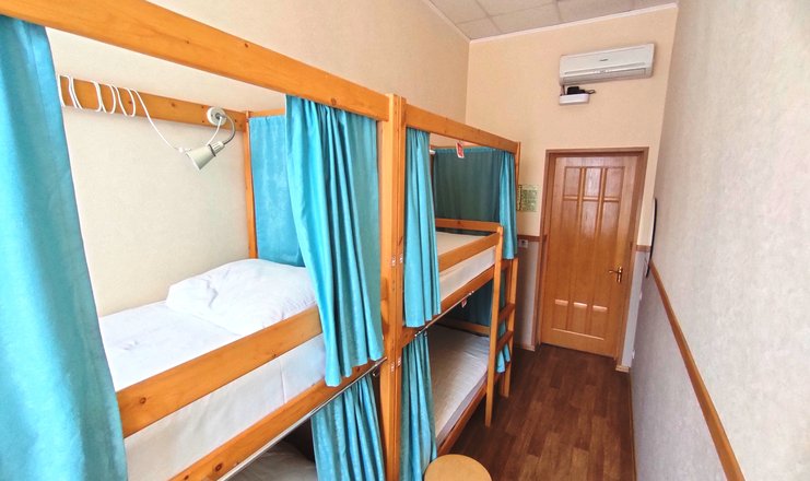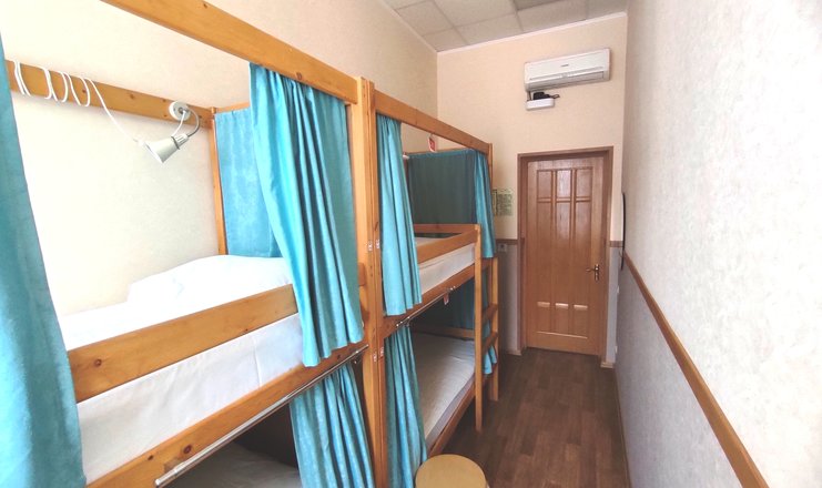 В номере: кровати двухъярусные, вешалка, зеркало, стол, табуреты, кондиционер