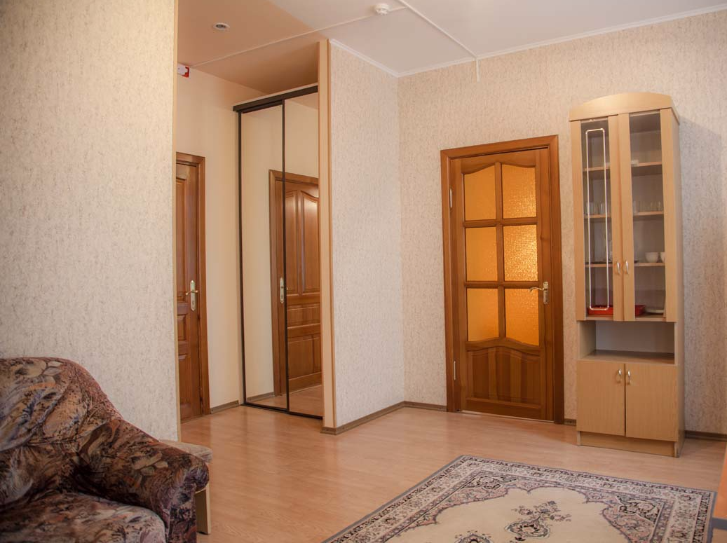 В номере: полутораспальная кровать, прикроватные тумбы, стол, стул, диван, шкаф, холодильник, электрочайник, микроволновая печь, телевизор, телефон