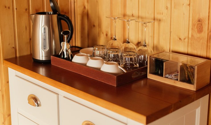 В номере: кровати односпальные: 2 шт., дополнительные, кровать двуспальная: 2 шт., прикроватные тумбочки, стол, стулья, шкаф, Оборудование, набор посуды, холодильник, чайный набор посуды, электрочайник