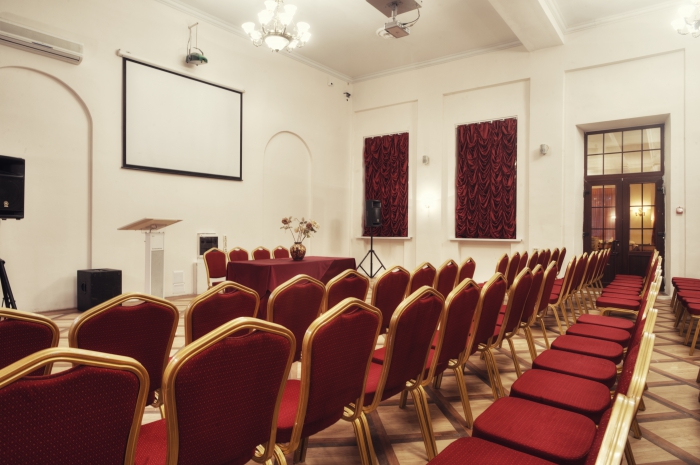 Площадь — 60 м2. Вместимость — до 45 человек. Оснащен мультимедийным проектором, экраном, звуковым оборудованием мощностью 1,2 кВт, микрофонами, модулем докладчика, микшерным пультом с возможностью подключения дополнительных звуковых носителей и обработкой голоса. Вы также можете воспользоваться доской докладчика, ватманом, маркерами и другим инвентарем. Проектор коммутируется как с компьютером, так и с DVD-носителем.