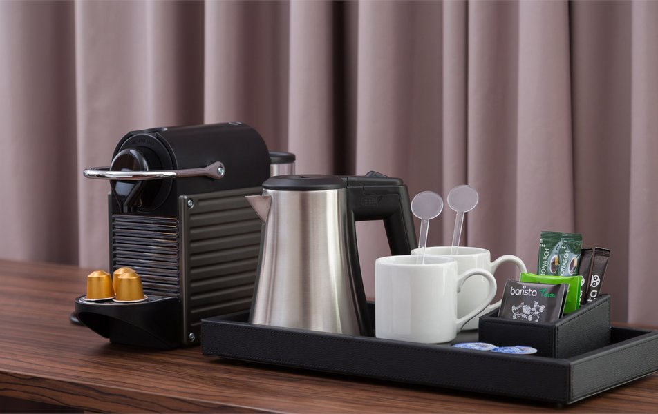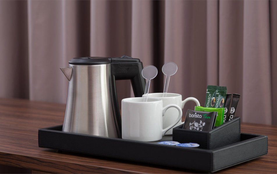 В номере: кровать двуспальная, прикроватные тумбочки, стол, стулья, шкаф, гладильная доска, кофемашина, сейф, сплит-система, телевизор, телефон, утюг, холодильник, чайник