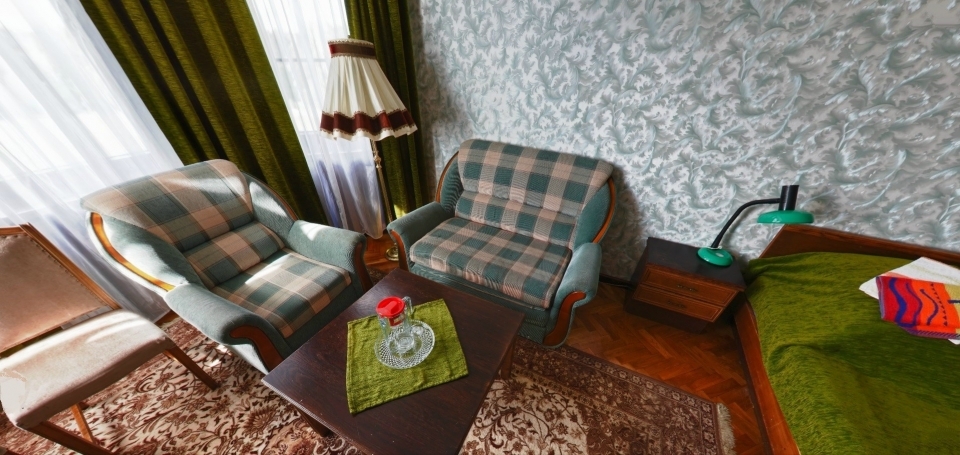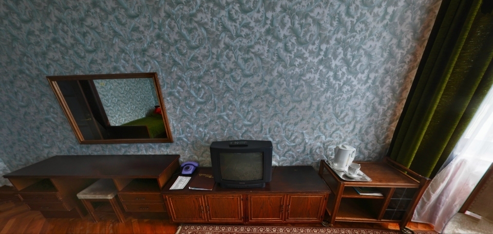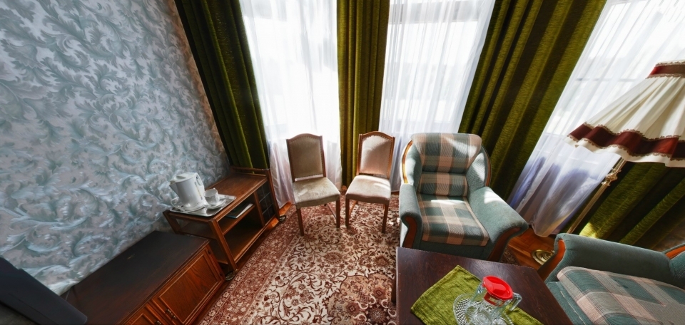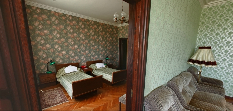 В номере: Кресло, диван, 2 кровати, торшер, шкаф, холодильник, телевизор, телефон, электрочайник.