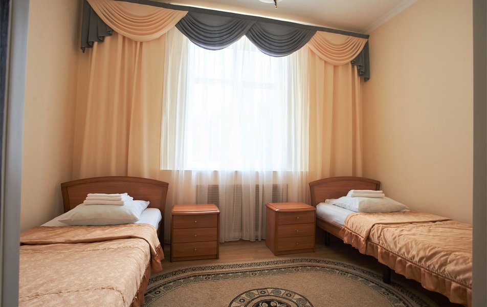 В номере: вешалка, зеркало, кресло, кровати односпальные /одна двуспальная кровать, прикроватные тумбочки, стол, столик журнальный, шкаф, телевизор, телефон, холодильник, чайный набор посуды, электрочайник