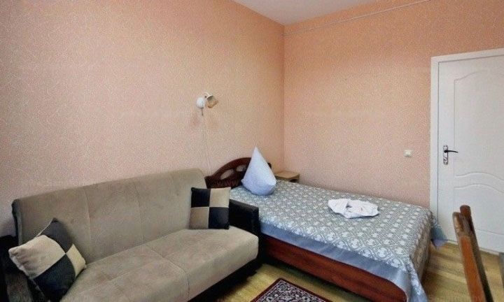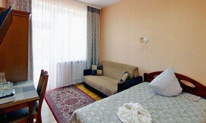 В номере: односпальная кровать, прикроватная тумбочка, стол, стул, шкаф, диван, телевизор, холодильник