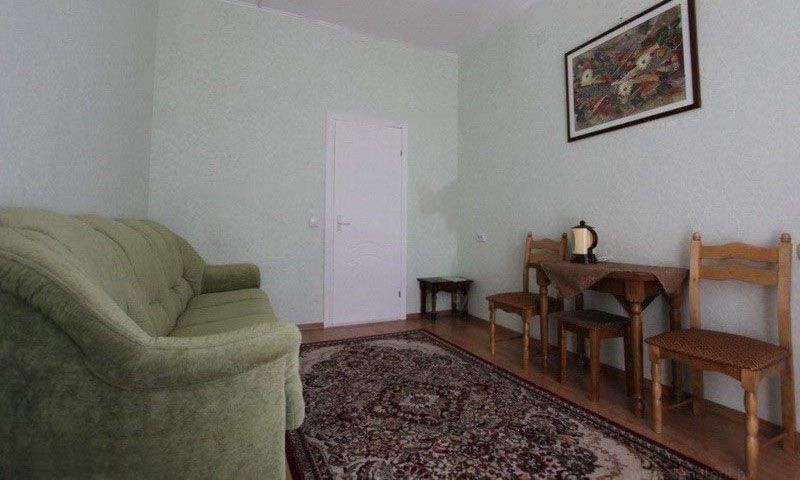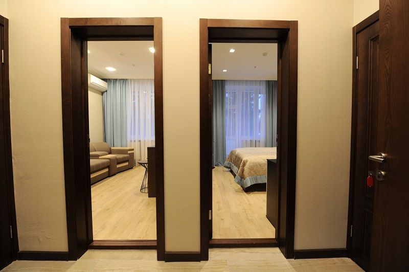 В номере: две комнаты: спальня и гостиная с кухней, кровати односпальные /одна двуспальная кровать, прикроватные тумбочки, стол, стулья, шкаф, мягкая мебель, кондиционер, набор посуды, телевизор, холодильник, электрочайник