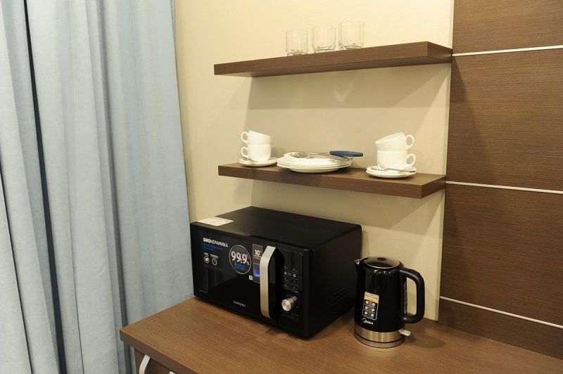 В номере: кровати односпальные, прикроватные тумбочки, стол, стулья, шкаф, набор посуды, телевизор, холодильник