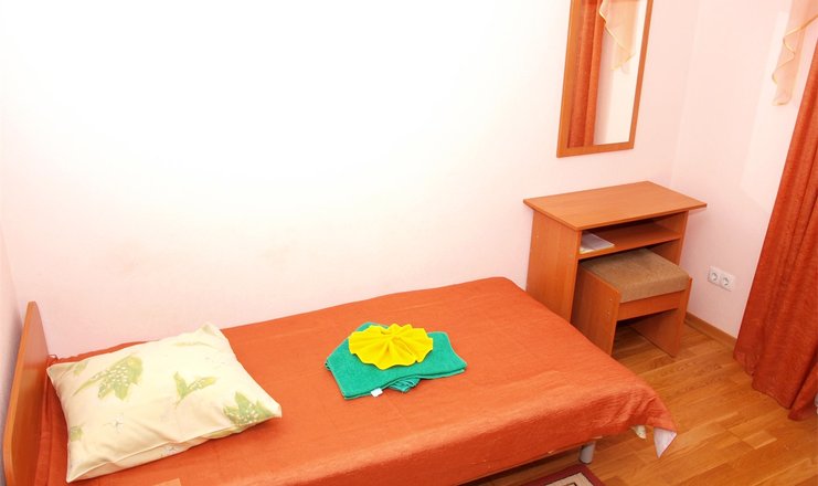 В номере: мини-холодильник, одна полуторная кровать, стол, стул, телевизор, тумбочка, электрочайник, набор посуды, зеркало, вешалка