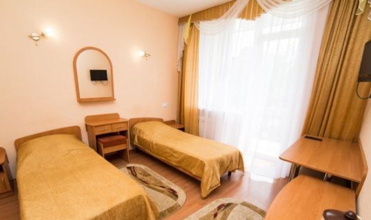 В номере: вешалка, зеркало, кровати односпальные, прикроватные тумбочки, стол, стулья, шкаф встроенный, мини-холодильник, набор посуды, телевизор