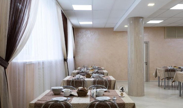 Приемы пищи проходят в уютной столовой с обеденным залом на 120 посадочных мест, где гостям предоставляется 5-и развое сбалансированное разнообразное питание (заказное меню из 2-4 вариантов с элементами шведского стола: свежая выпечка, сухие завтраки, кофе, горячее молоко к завтраку, в обед - салат-бар; диетические столы: диета - Б, Б(д), П.