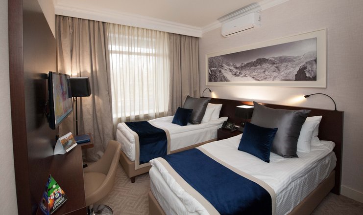 В номере: кровать двуспальная, стол, столик туалетный, стулья, гладильная доска, набор посуды, сейф, сплит-система, телевизор, утюг, холодильник, электрочайник