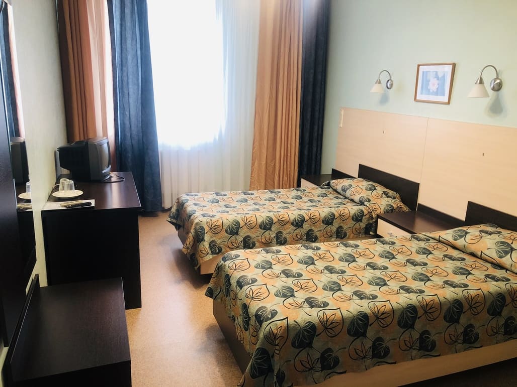 В номере: вешалка, зеркало, кровати односпальные: 2, прикроватные тумбочки, стол, стулья, шкаф, телевизор