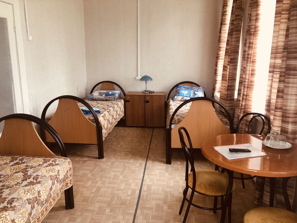 В номере: вешалка, зеркало, кровати односпальные: 3, прикроватные тумбочки, стол, стулья, шкаф, телевизор, чайный набор посуды