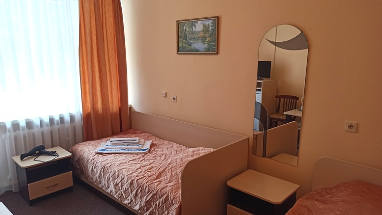 В номере: вешалка, зеркало, кровать односпальная, прикроватные тумбочки, стол, стул, шкаф, раскладушка на доп. место