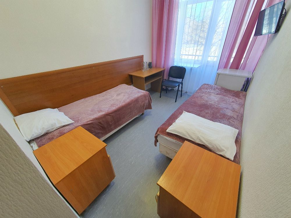 Оснащение номера: две односпальные кровати, прикроватные тумбы, стол, стулья, шкаф для одежды, телевизор, холодильник, электрочайник, бесплатный интернет Wi-Fi