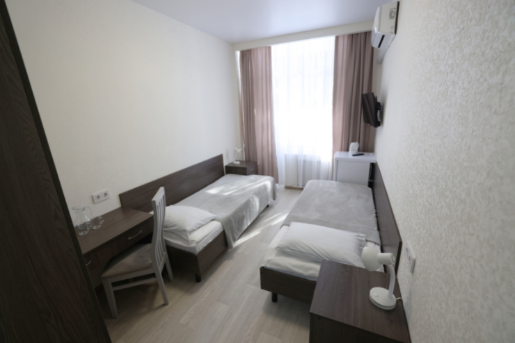 Оснащение номера: две односпальные кровати, прикроватные тумбы, стол, стулья, шкаф для одежды, телевизор, холодильник, кондиционер, электрочайник, сушилка для белья, бесплатный интернет Wi-Fi