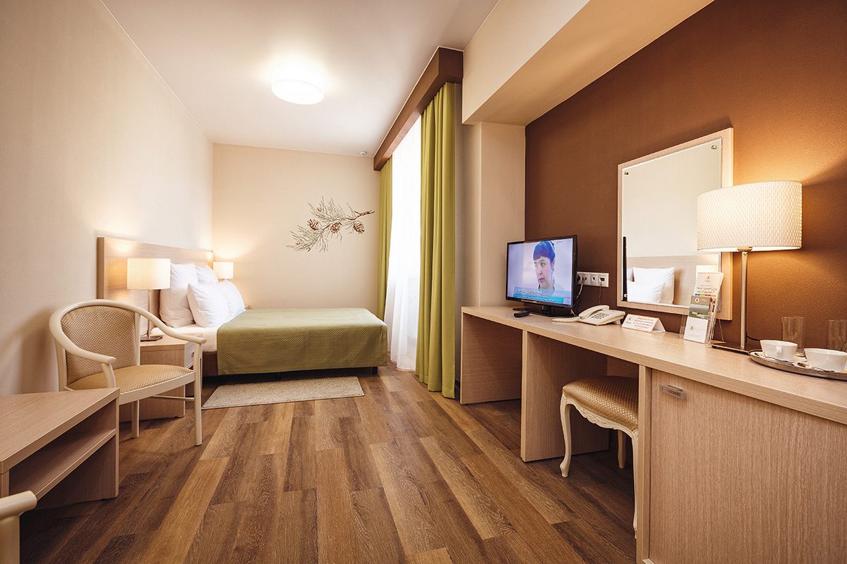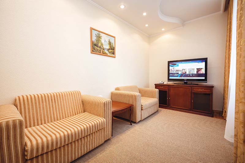 В номере: две односпальные кровати или рдна двуспальная, прикроватные тумбочки, шкаф, столик журнальный, туалетный столик, телевизор, телефон, чайник, холодильник, сушилка для белья