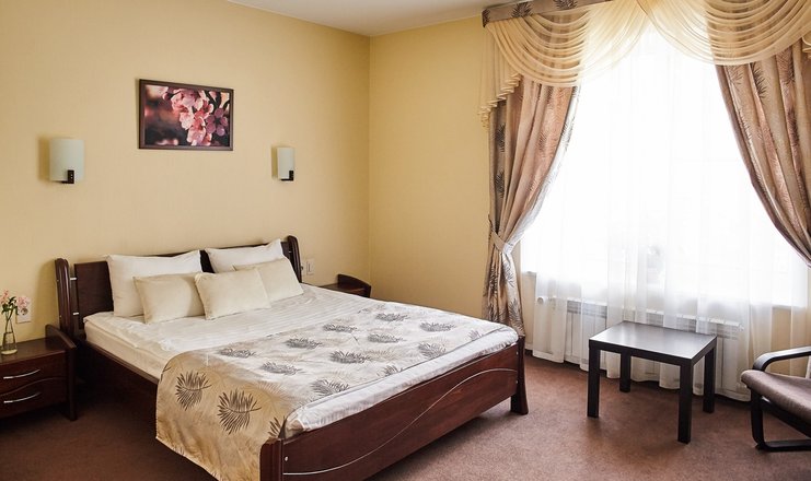 В номере: вешалка, кресло, кровать двуспальная, прикроватные тумбочки, столик журнальный, шкаф, кондиционер, кофемашина: капсульная, телевизор ЖК, телефон, холодильник, чайный набор посуды, электрочайник