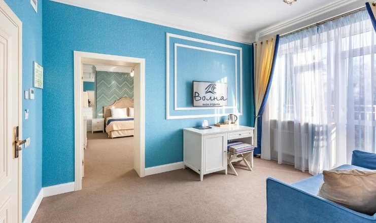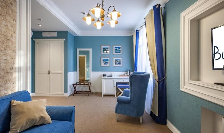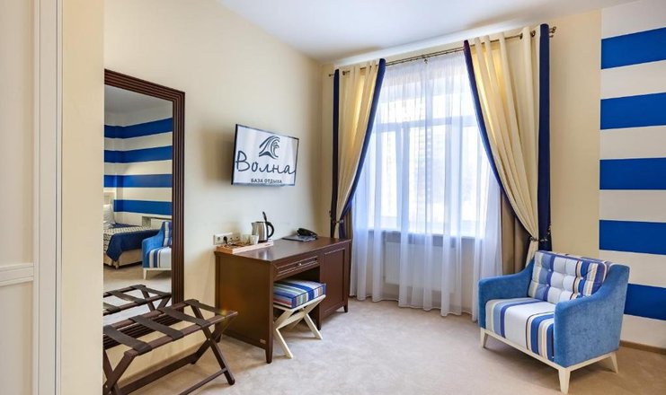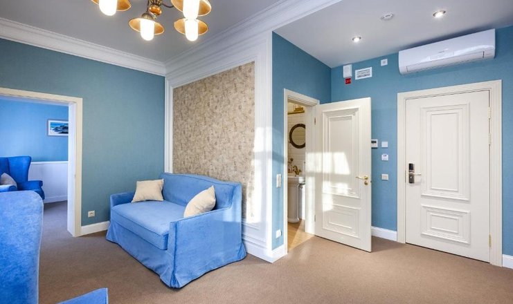 В номере: диван раскладной, зеркало, кресло, кровать двуспальная, прикроватные тумбочки, стол, стулья, тумба багажная, шкаф, кондиционер, мини-холодильник, сейф, телевизор ЖК, телефон, чайный набор посуды, электрочайник