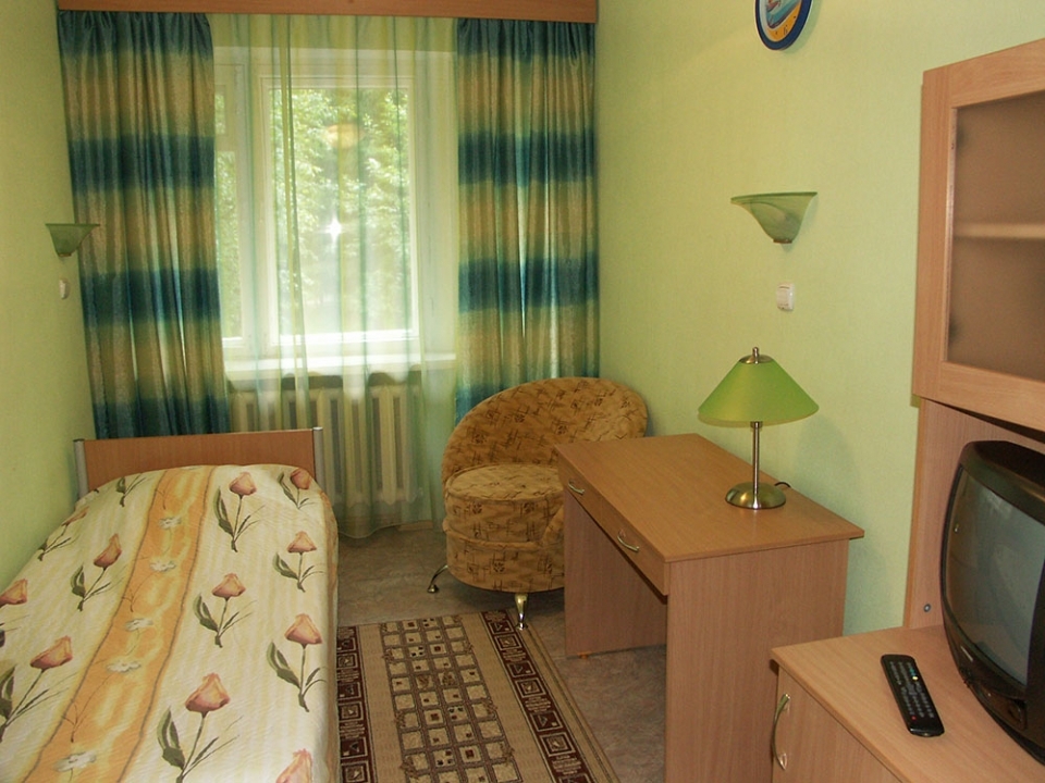 В номере: односпальная кровать, ТВ, холодильник, кресло, журнальный стол, телефон, сейф, шкаф, кондиционер,