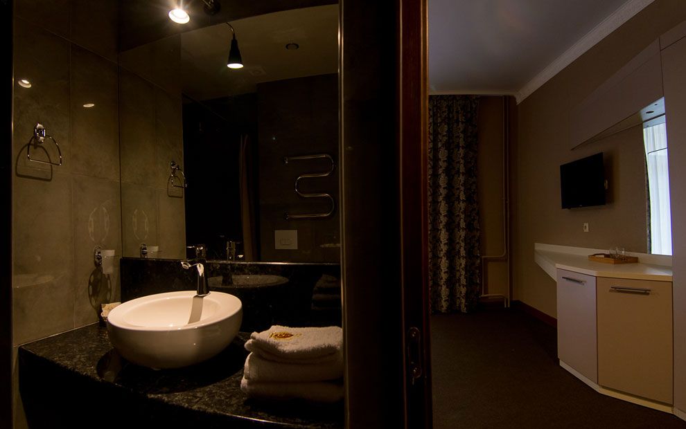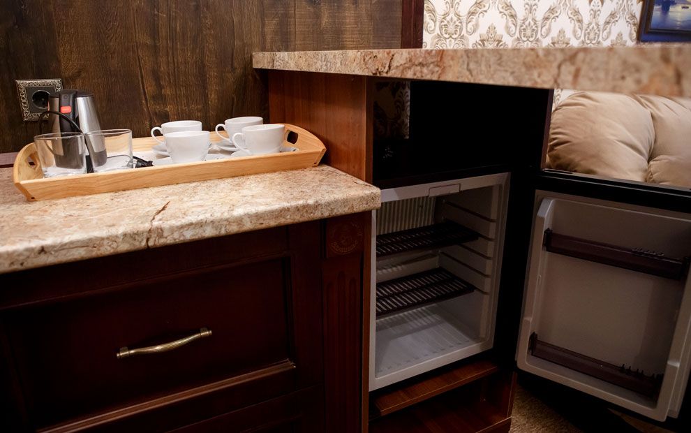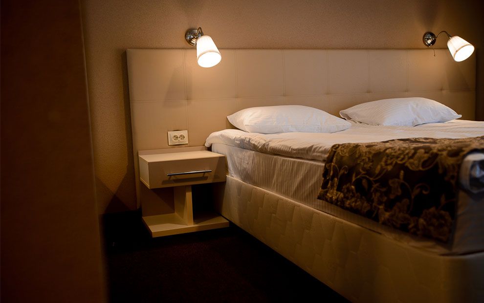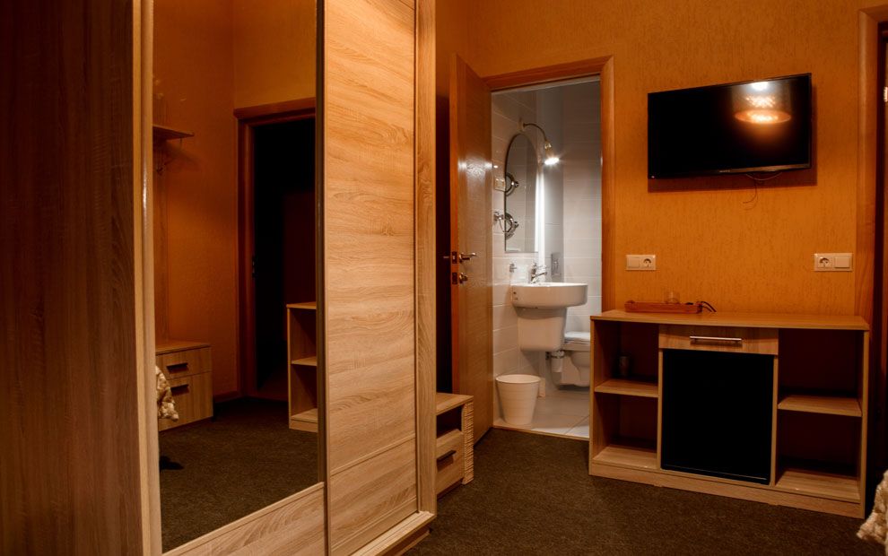 В номере: две полутораспальные кровати или двуспальная, прикроватные тумбы, стол, стулья, шкаф, телевизор, холодильник, чайник, набор посуды