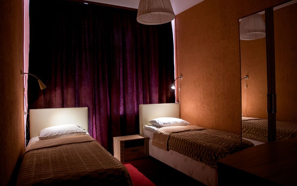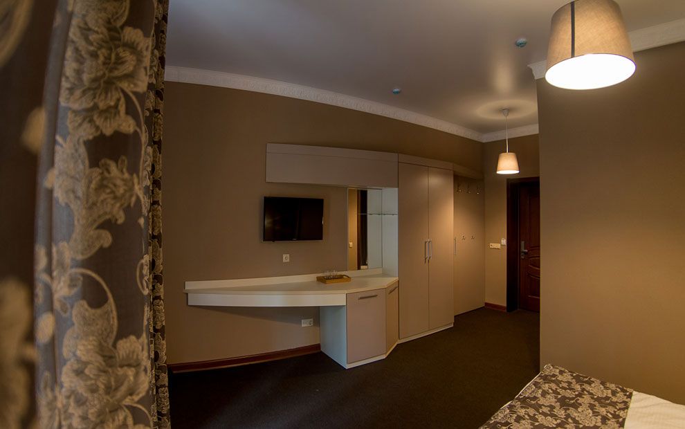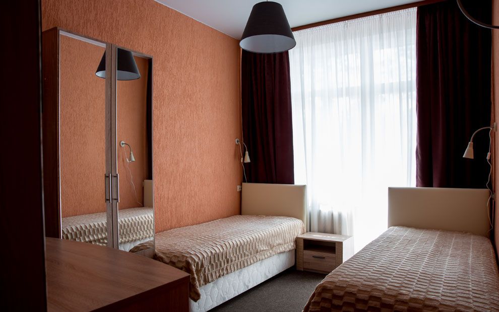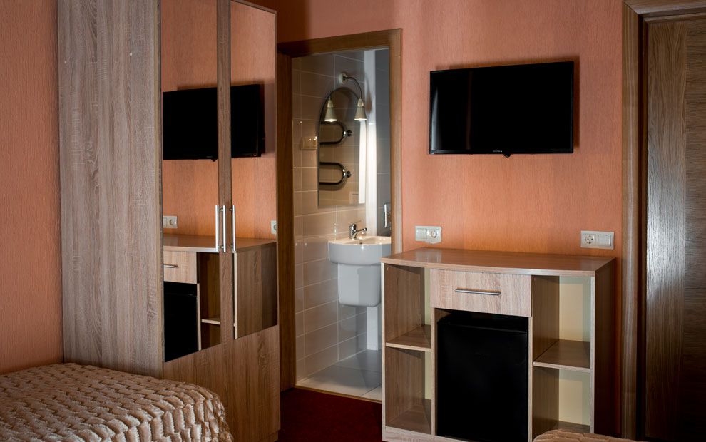 В номере: две полутораспальные кровати, прикроватные тумбы, стол, стул, шкаф, телевизор, мини-бар
