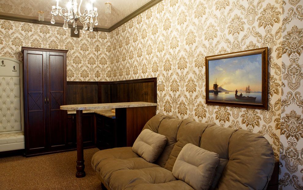 В номере: двуспальная кровать, прикроватные тумбы, стол, стул, шкаф, мягкая мебель, журнальный столик, телевизор, холодильник, чайник, набор посуды